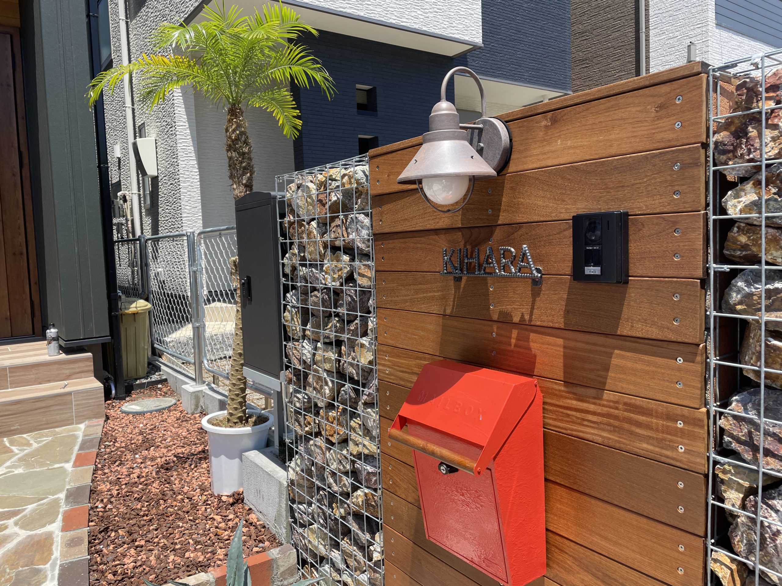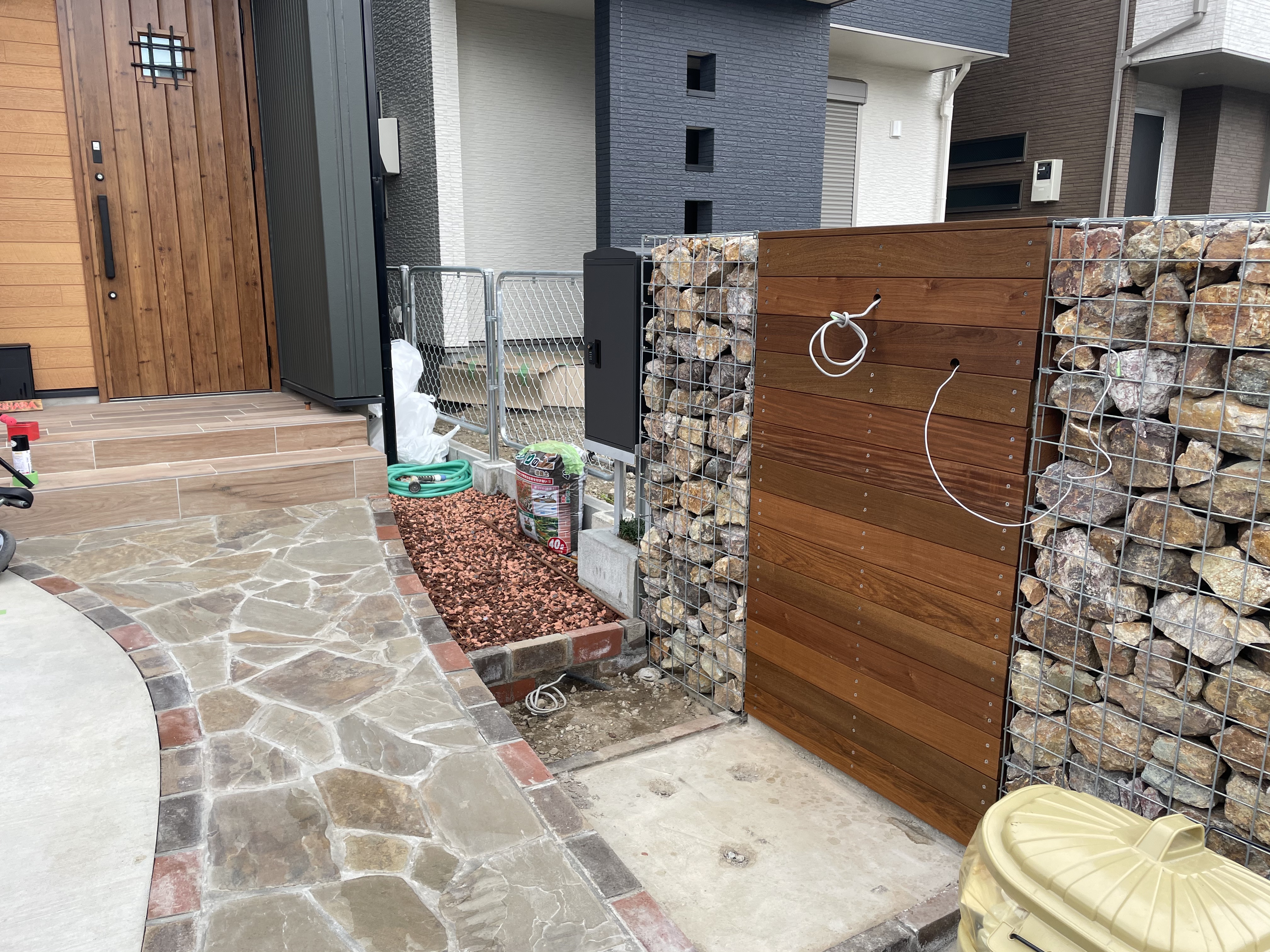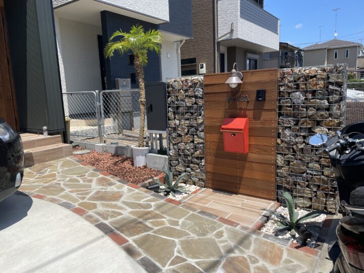 ガビオン(石材入りワイヤーバスケット)とウッドパネルを組み合わせた門柱が、重厚感と温かみを両立。